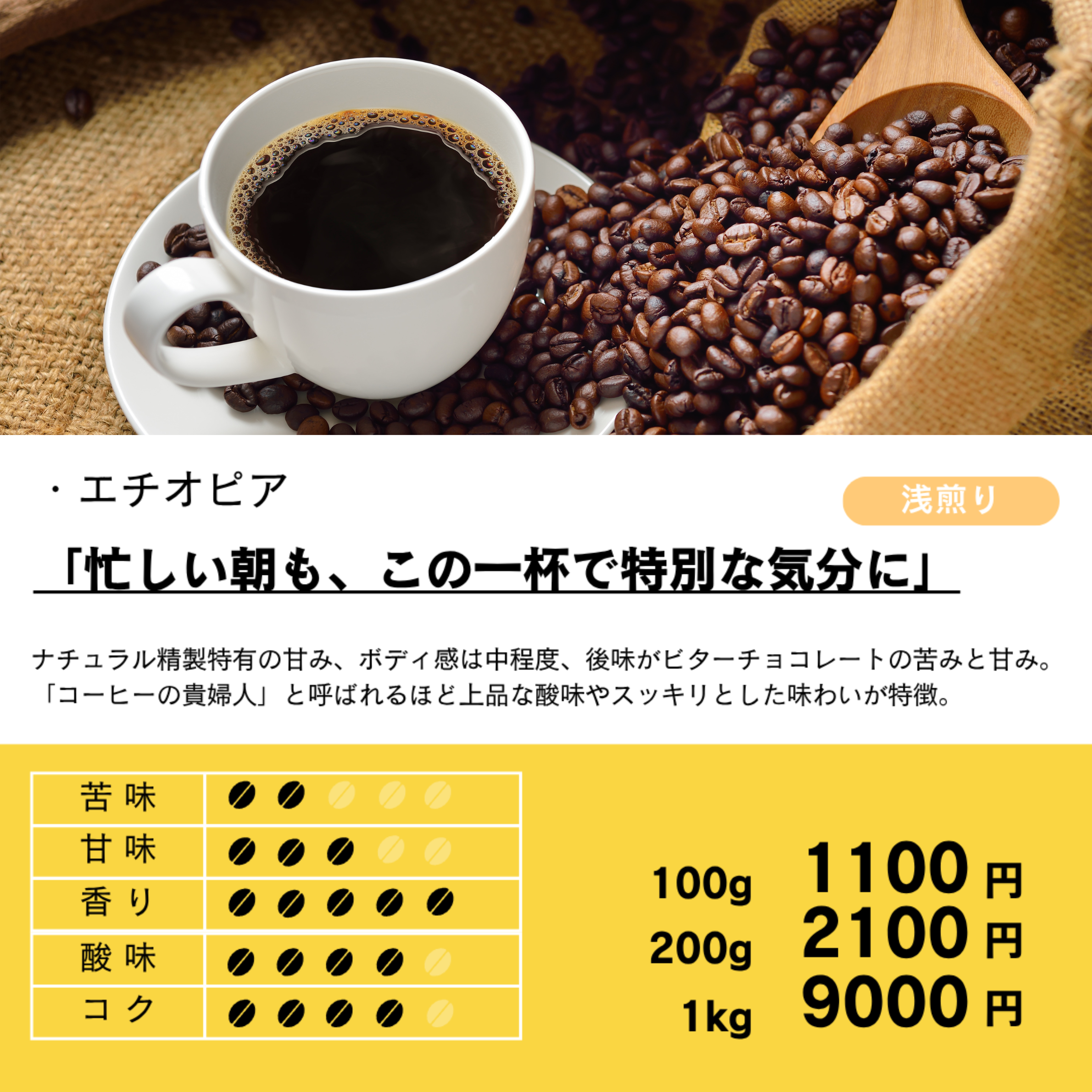 完全オーガニックのエチオピア産の浅煎りコーヒー豆です。