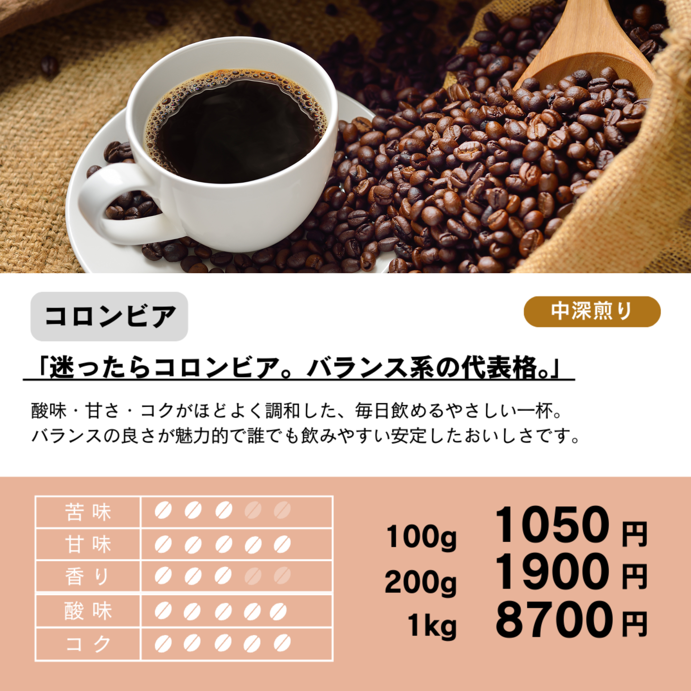 完全オーガニック、コロンビア産の中深煎りコーヒー豆です。