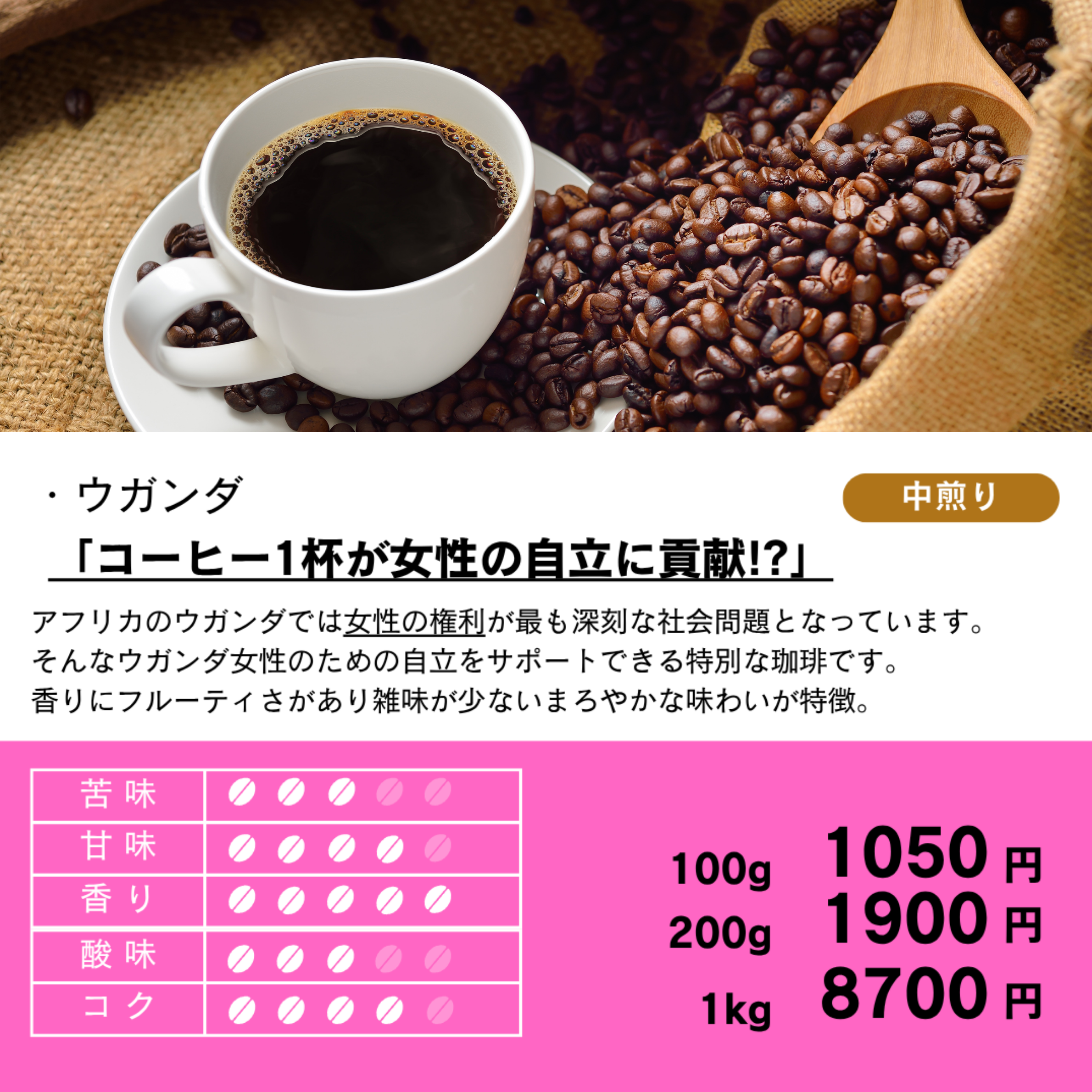 完全オーガニック、ウガンダ産の中煎りコーヒー豆です。